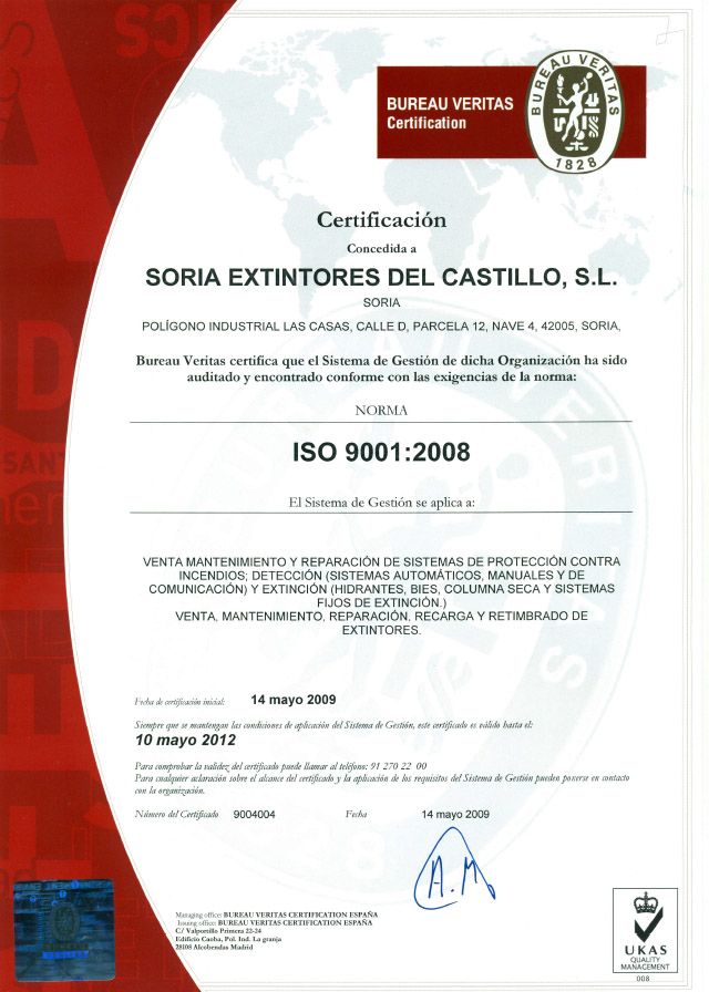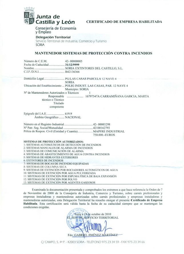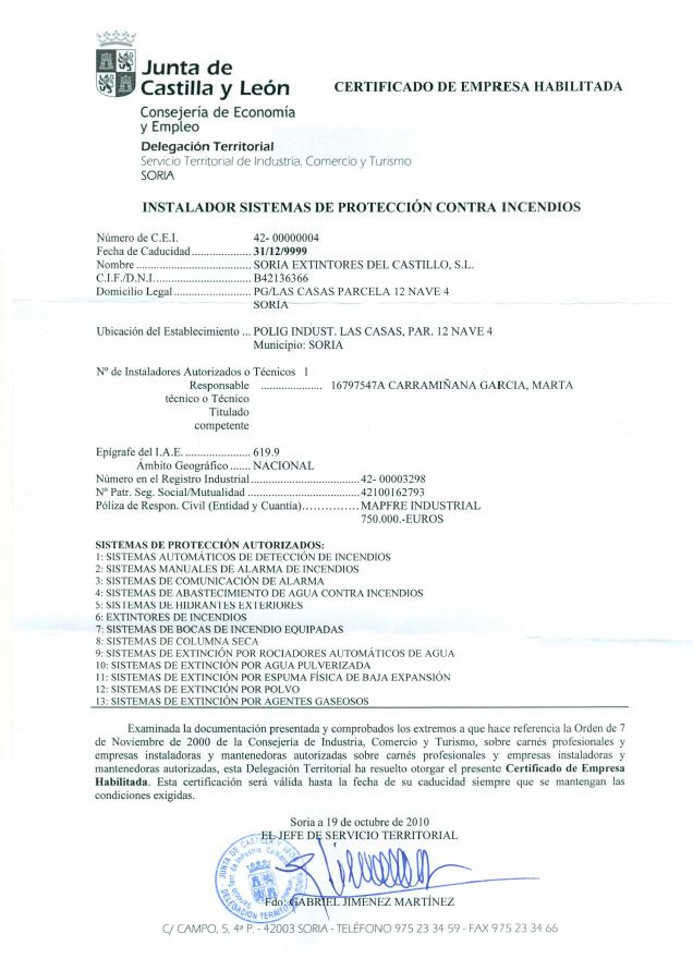 Servicios Empresa autorizada por la Junta de Castilla y León para la instalación y mantenimiento de todos los equipos de protección contra incendios. 42-0004 y 42-0005 R.I. 42-00003298 Certificación ISO 9001 Instalador de Sistemas Mantenedor de Sistemas